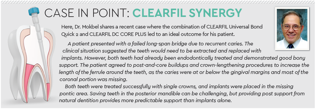 “CLEARFIL Universal Bond Quick 2 will penetrate into the dentin tubules and pull back on DC CORE PLUS to keep it from contracting away from the dentin,” Dr. Mokbel assured. “The 2 materials acting in synergy improves the retention of DC CORE PLUS.”