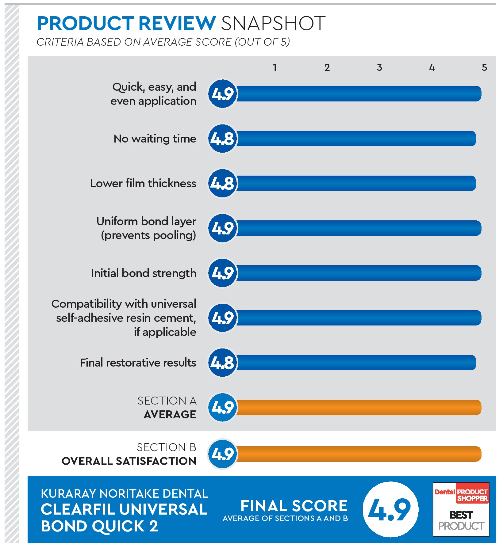 Dr. Tiffany Brady liked the adhesive’s “thin, easy application,” finding it allowed for “quicker restorations,” and Dr. James DeFilippo appreciated “the minimal number of steps and universal applications.” With that, Dr. Ira Newman said, “It streamlines product inventory with 1 bottle, and its quick application requires less time for bonding procedures.”