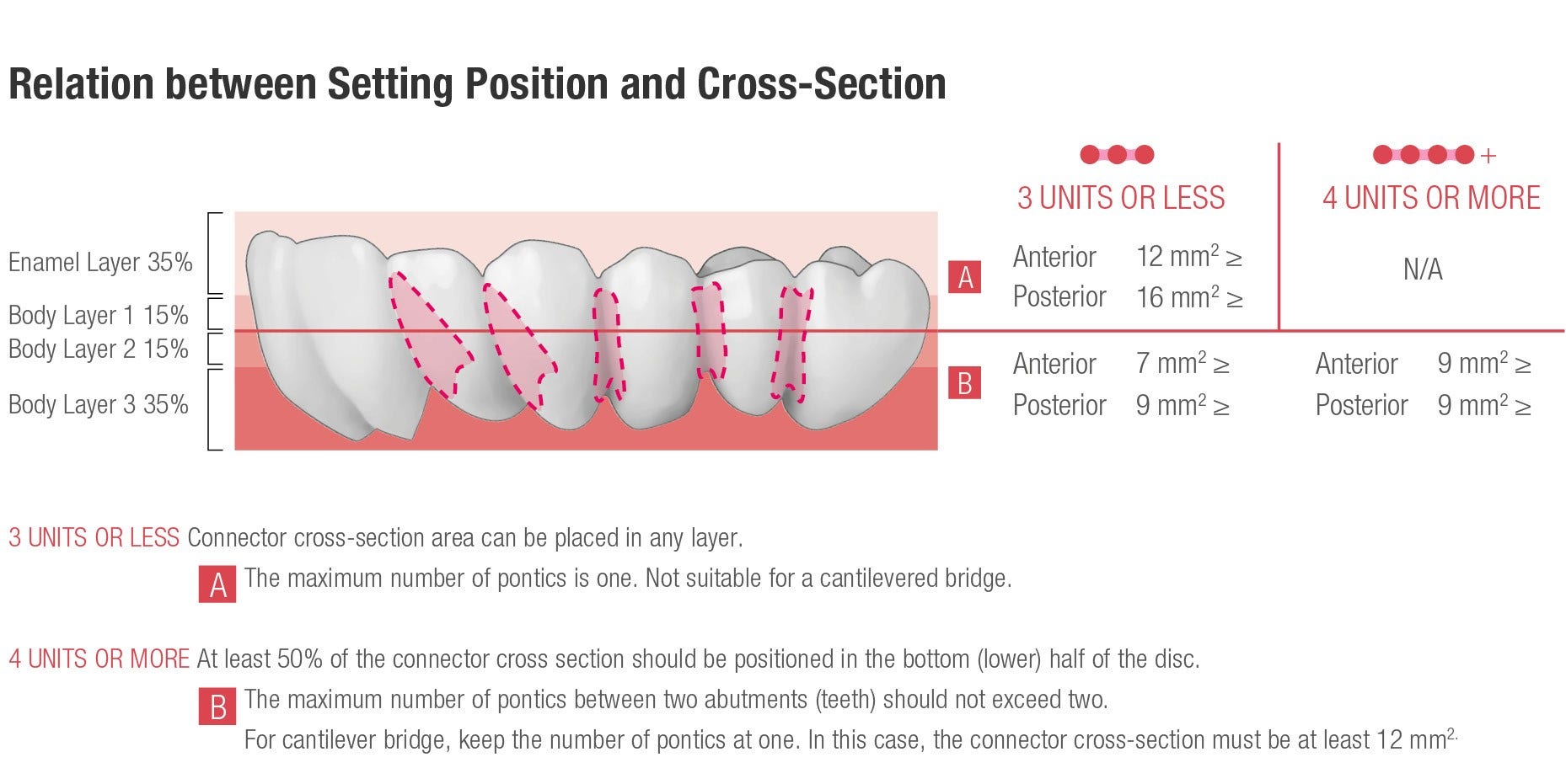 Positioning of restorations in KATANA™ Zirconia YML discs is extraordinarily easy. The reason is that the gap between the lowest flexural strength found in the enamel area and the highest flexural strength found in the lowest body layer is comparatively small. Moreover, the Body Layer 1 that is found adjacent to the enamel layer already offers a flexural strength that is higher than the 800 MPa requested for bridges with four or more units. Consequently, the material is classified as a Class 5 zirconia and users are on the safe side whenever they place their long-span restorations in the middle of the blank.