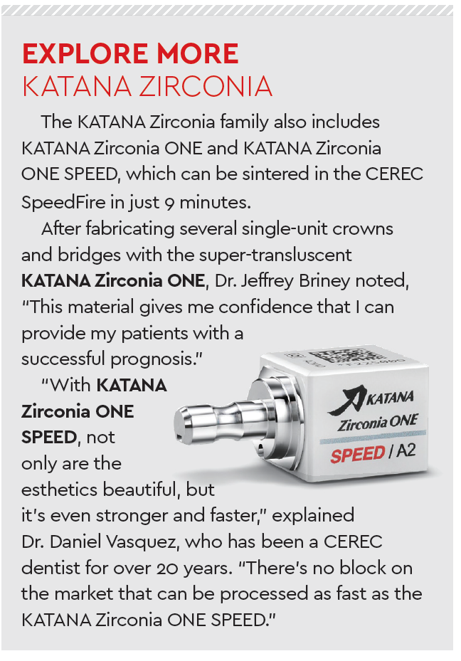 A presintered zirconia block designed specifically for chairside use, KATANA™ Zirconia ONE For IMPLANT presents a worthy solution. The block allows for fully digital fabrication of a hybrid abutment crown or hybrid abutment within the same appointment. When paired with the CEREC workflow, dentists can provide a precise, esthetic implant restoration in under an hour.