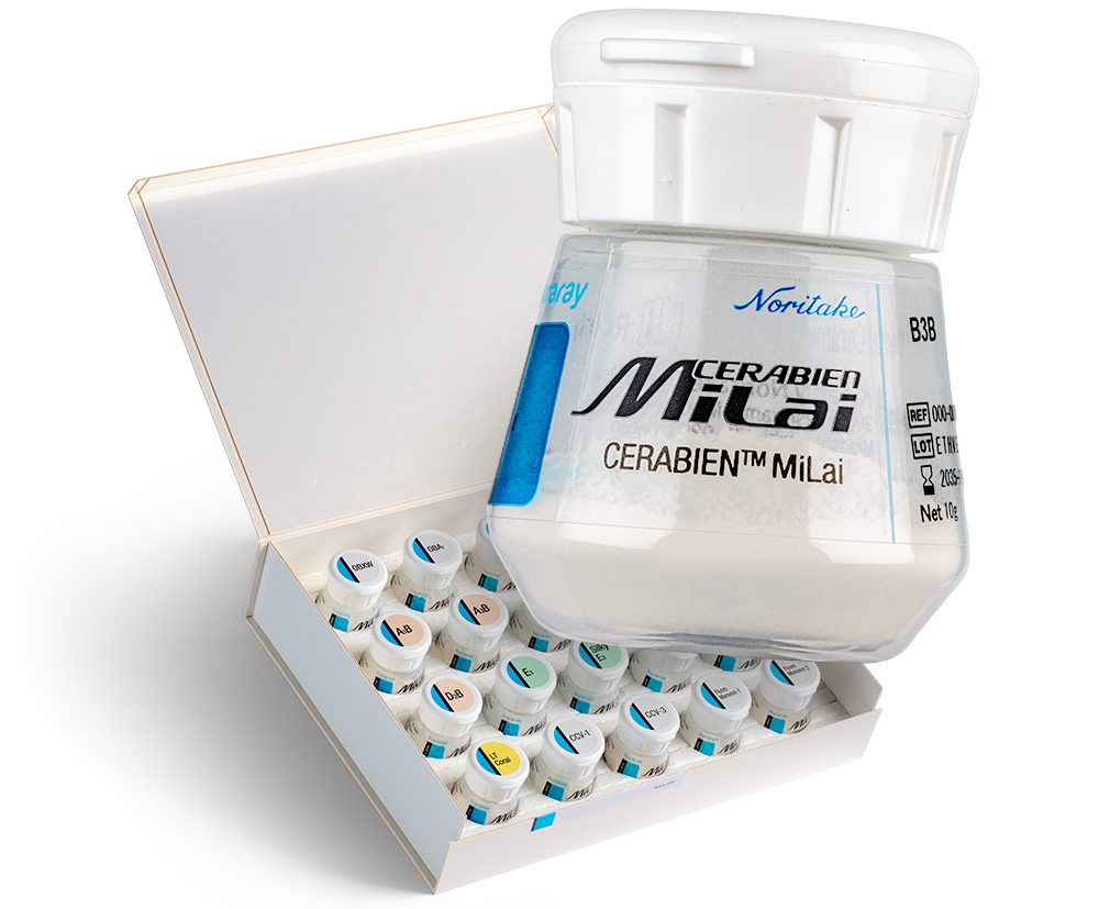 CERABIEN™ MiLai is a new porcelain system specifically designed for the purpose of offering a less complex micro-layering technique that produces the desired outcomes, even when esthetic expectations are high. Its compact lineup of low-fusing porcelains and internal stains supports efficient, economical finishing procedures that deliver outstanding esthetics on the first attempt.
