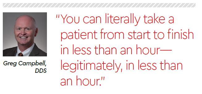 To that end, they developed a new proprietary zirconia powder that can reach a highly activated state with little energy, which results in an accelerated 9-minute sintering process. “You can literally take a patient from start to finish in less than an hour—legitimately, in less than an hour,” said Dr. Campbell. “It’s unheard of.”